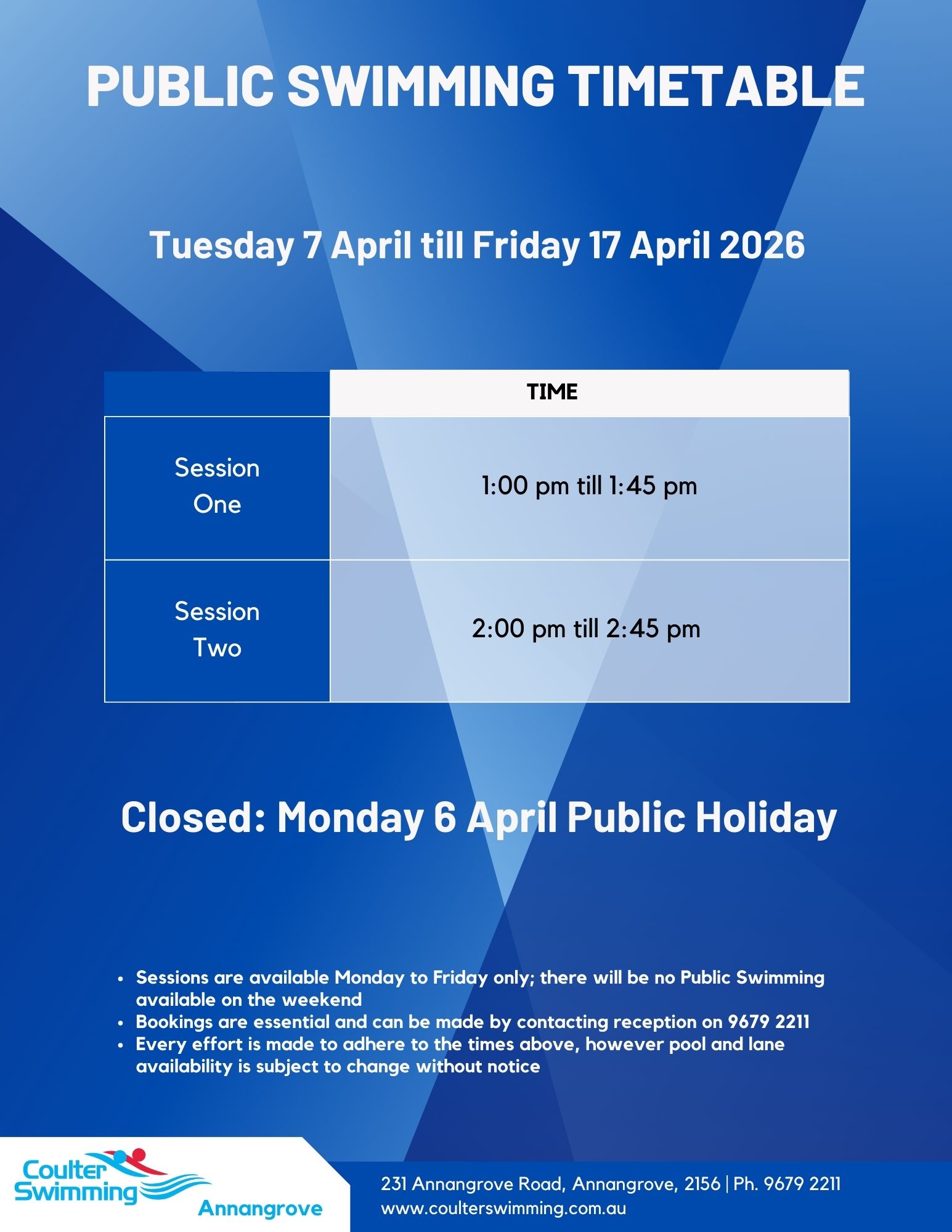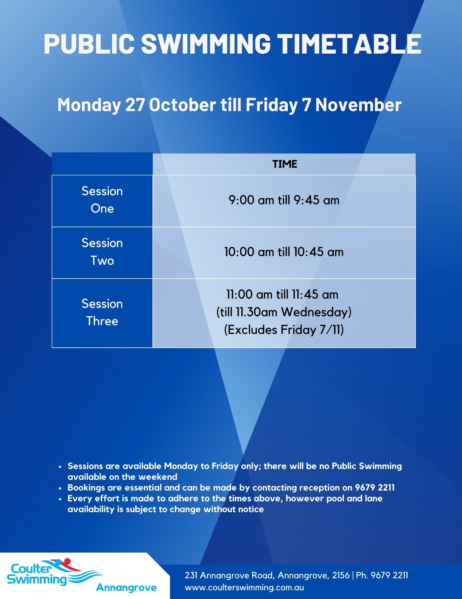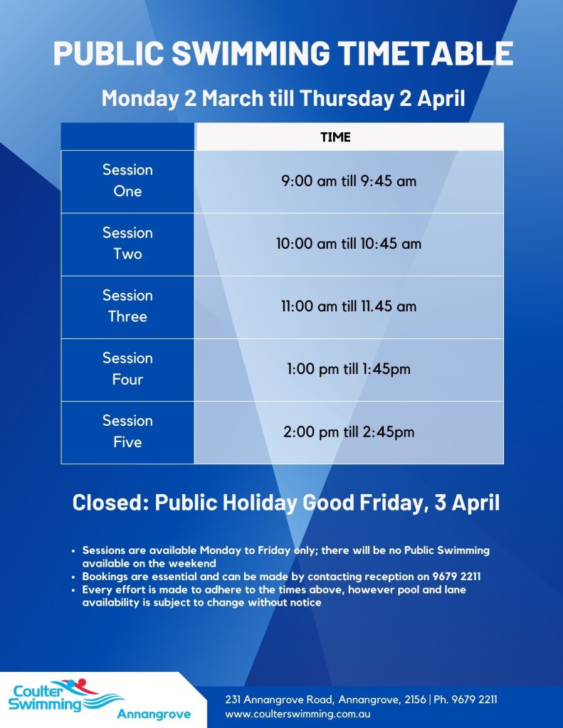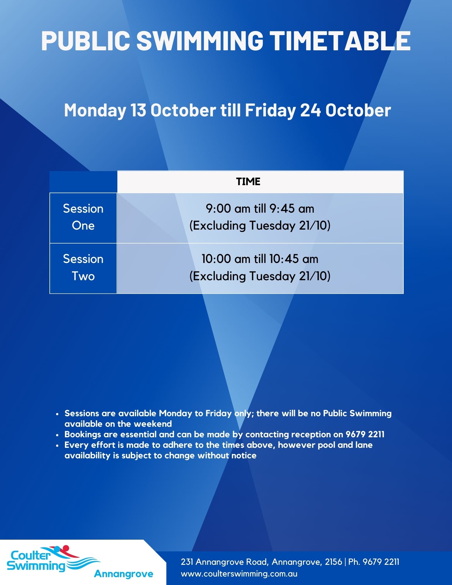Public Swimming at Coulter Swimming AnnangroveOur current Public Swimming timetable can be viewed below. Bookings are essential, and can be made by contacting reception on 9679 2211.