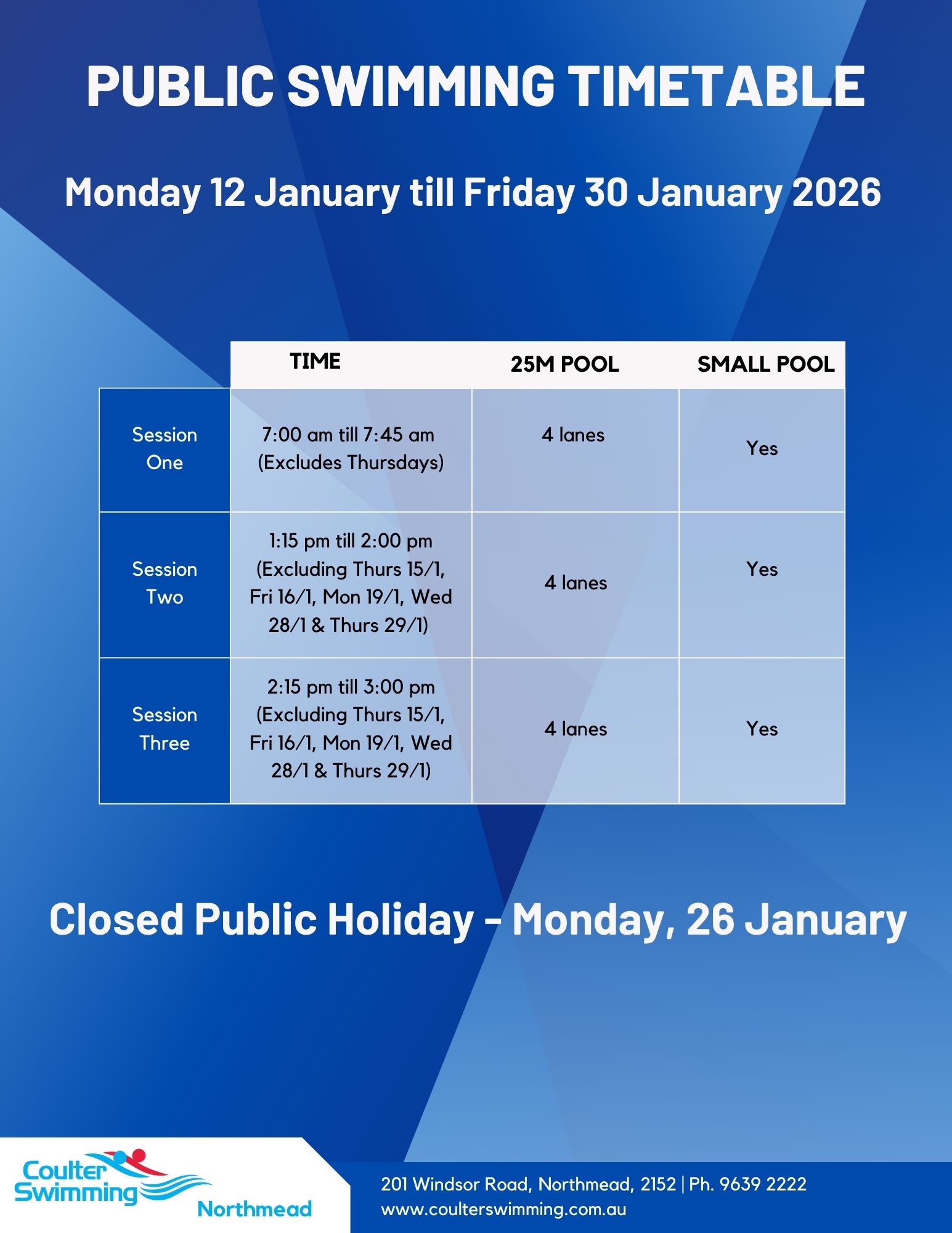 There will be no Public Swimming available from Saturday 13 December 2025 until Sunday 11 January 2026.